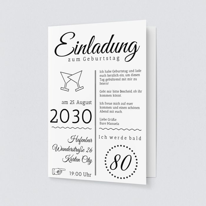 Wir versichern Ihnen dass Sie von uns im Kartenparadies Einladungskarten zum runden Geburtstag in Top-Qualität erhalten. Geburtstag zum selbst gestalten und drucken lassen machst Du stilvoll und sehr persönlich auf Dein Geburtstagsfest aufmerksam. Mit Einladungskarten zum 80.